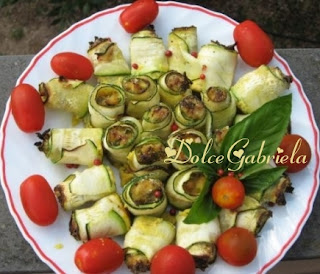 Stendete le fette di zucchina che avevate messo da parte e mettete su un estremo una pallina di composto. Arrotolate.