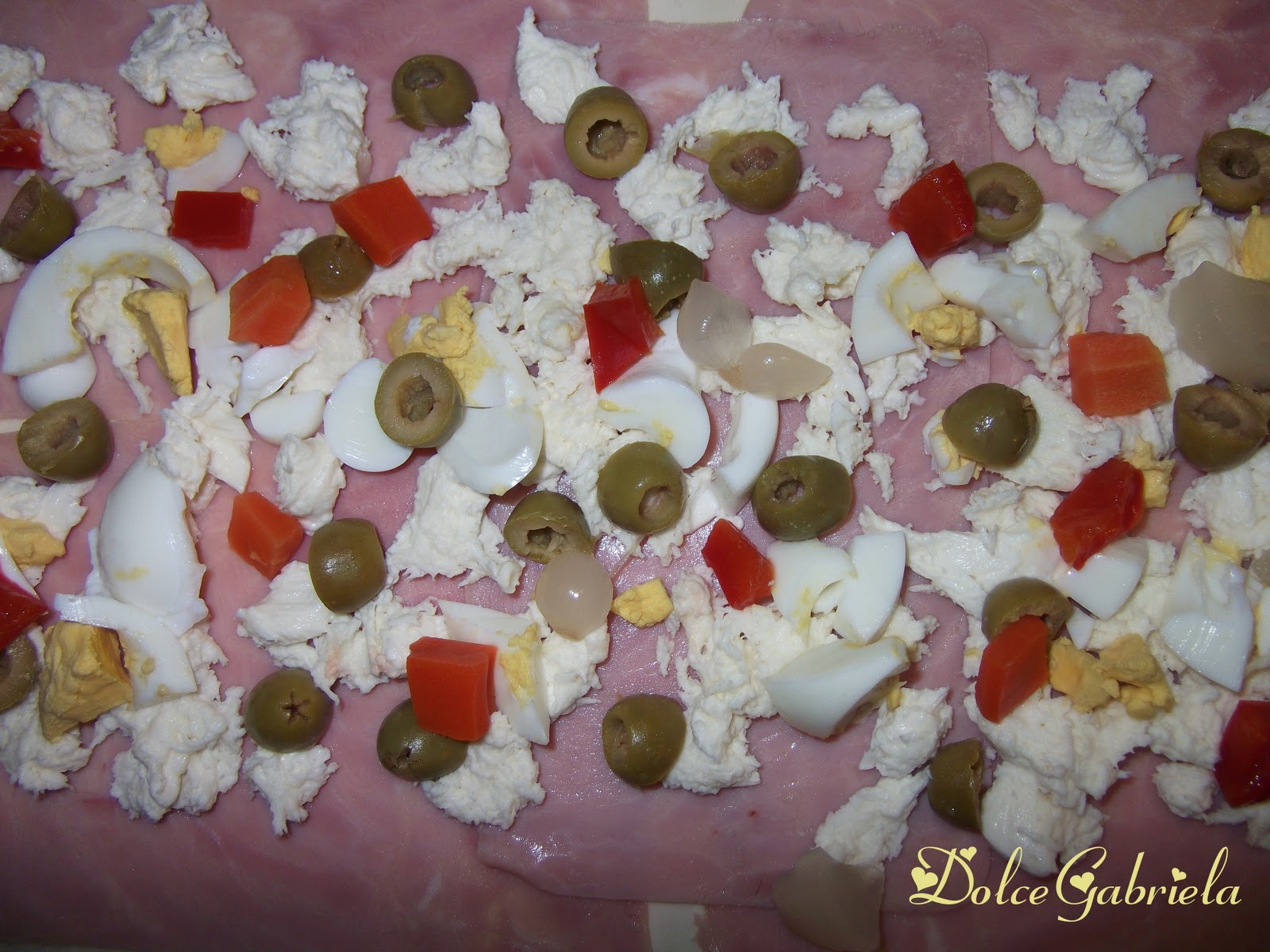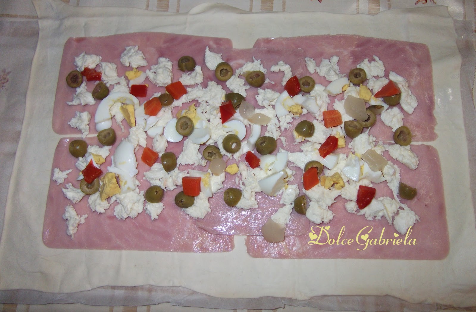 Aprire la pasta sfoglia su una spianatoia,(senza togliere la carta forno) sopra della quale disporrete tutti gli ingredienti.