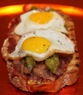Bruscolire il pane e mette sopra di essi il sale, olio d'oliva, il prosciutto, il pomodoro a fette, gli asparagi,